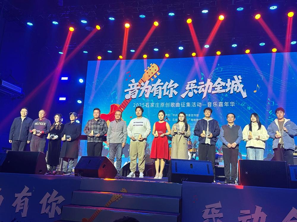 近日,由中共石家庄市委宣传部、石家庄市文化广电和旅游局联合主办的“2025石家庄原创歌曲征集活动”圆满落幕,评选结果正式揭晓。河北传媒学院音乐学院学生凭借扎实的专业功底与鲜明的创作特色脱颖而出,斩获佳绩。2022级艺术与科技专业学生秦嘉艺创作的歌曲《WALKING IN THE ROCK HOME TOWN》实力摘得“最佳歌曲奖”,2017届毕业生毛一鹏的《亲爱的你》、2024届毕业生韩昕初与蒲文宇联袂创作的《家》成功入围,并受邀在颁奖现场登台献唱原创作品,成为活动中一道亮眼的“河传风景”。