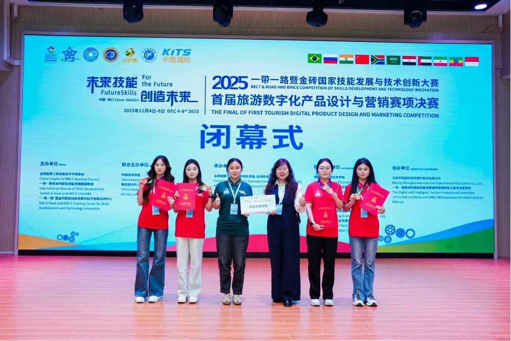 “金砖大赛”被列为中国高等教育学会大学生竞赛分析报告竞赛目录赛事(A类重点赛事),是教育部认可的白名单国际赛事。本次全国总决赛由金砖国家工商理事会中方理事会等单位主办,聚焦数字文旅产业发展需求,全面考察参赛团队在旅游产品数字化设计、营销方案创新、落地执行效能等方面的综合能力。我校参赛团队在比赛中沉着应战,在作品展示环节清晰阐述了旅游数字化产品的设计理念与核心亮点,在答辩环节精准回应评委关于方案落地性、数据应用等方面的提问,凭借扎实的专业功底、默契的团队协作与稳定的临场发挥,赢得了评委的一致认可。